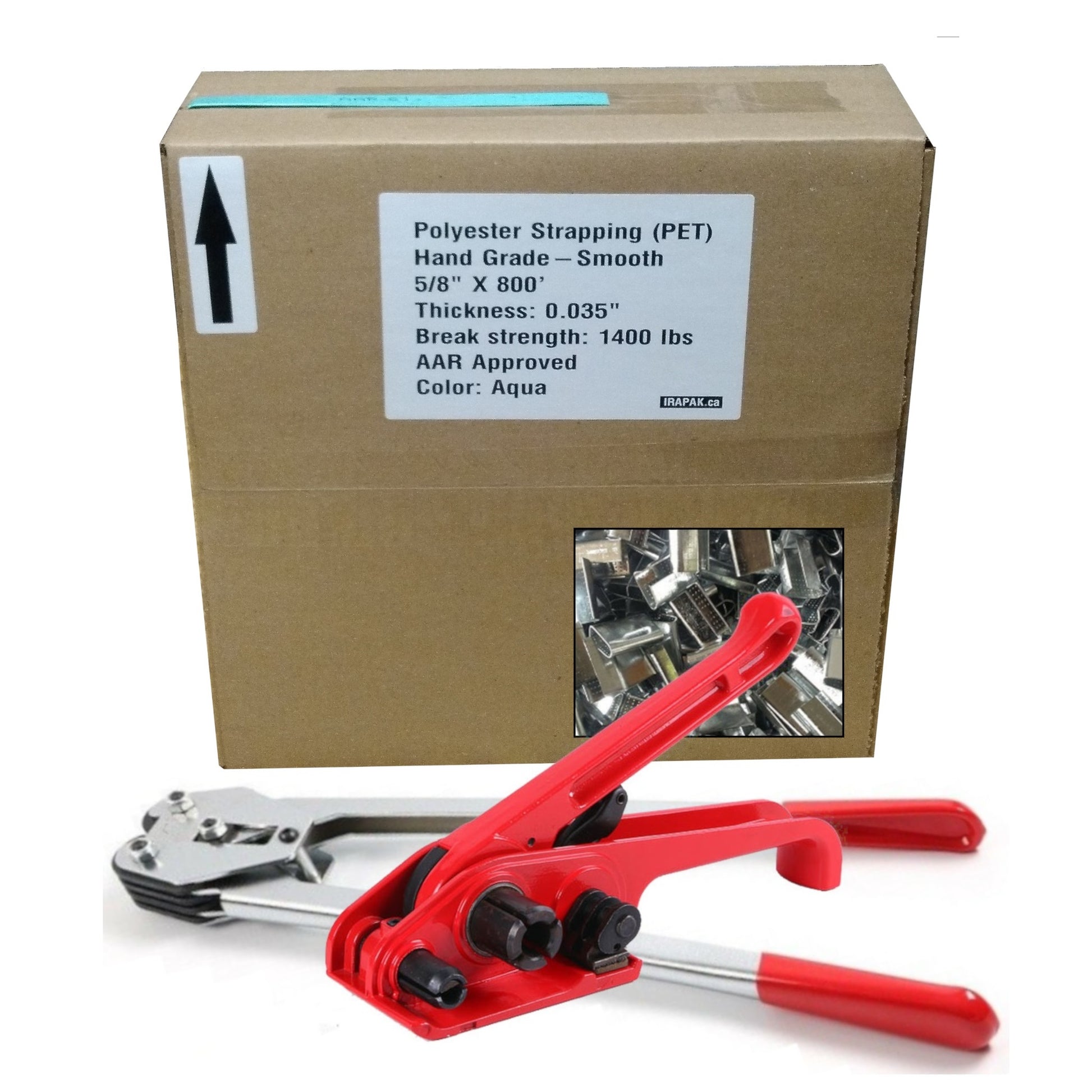 800 feet 5/8” x 0.035” polyester strapping 1400 lbs break strength. AAR approved